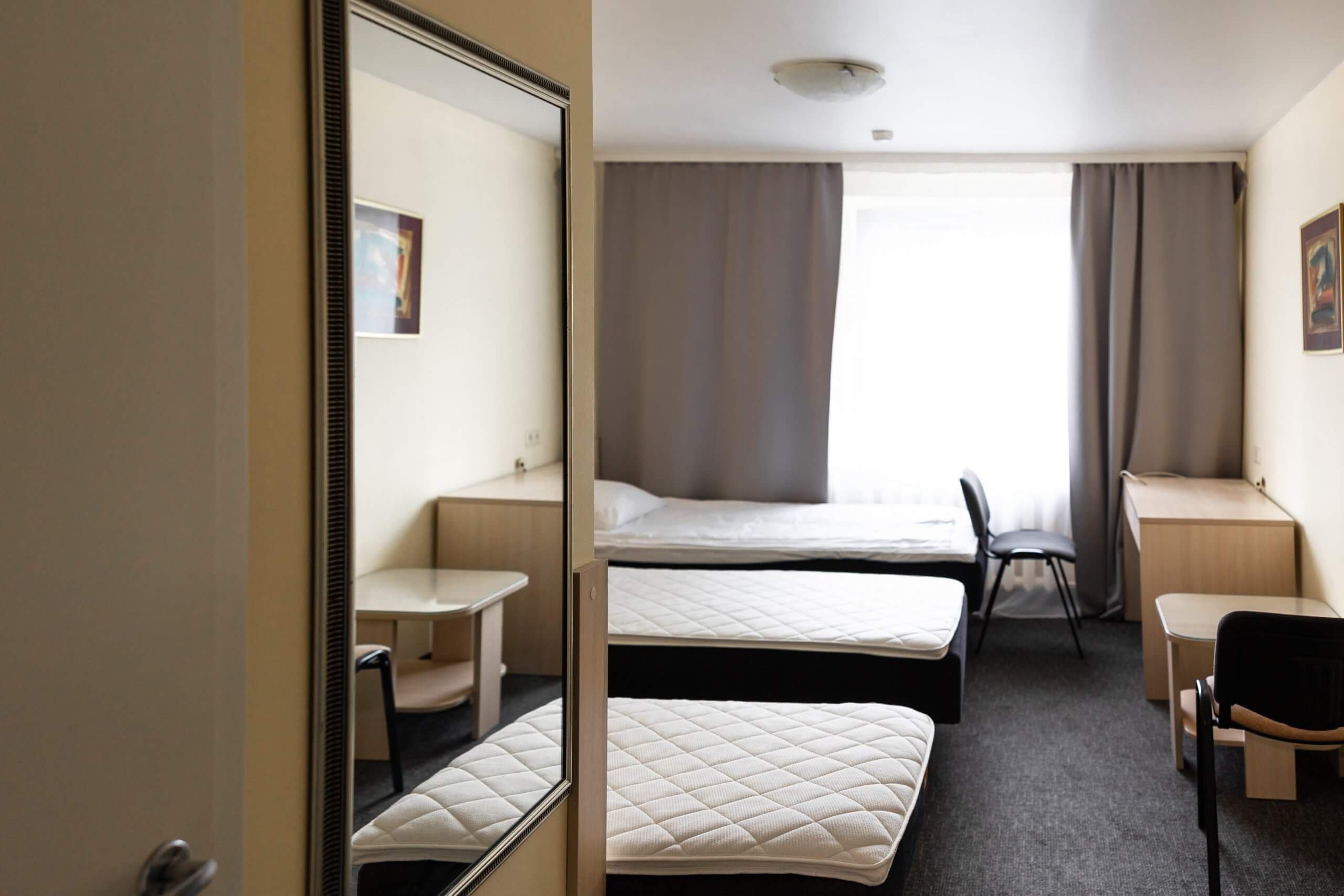Трехместные комнаты оборудованы собственным душем и туалетом, а также предусматривают функциональные зоны хранения личных вещей, места для приготовления пищи, помещения для стирки и сушки одежды, специальные пространства для самостоятельных занятий.