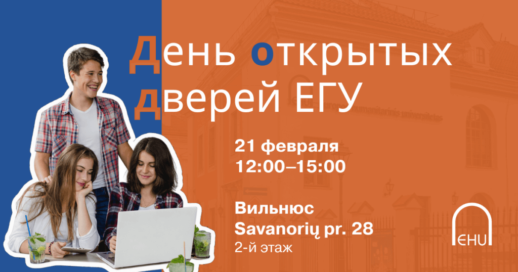 Всех, кто не сможет приехать в Вильнюс 21 февраля, мы приглашаем принять участие в Дне открытых дверей ЕГУ в онлайн-формате в субботу 21 марта в 10:00 (по Вильнюсу).
