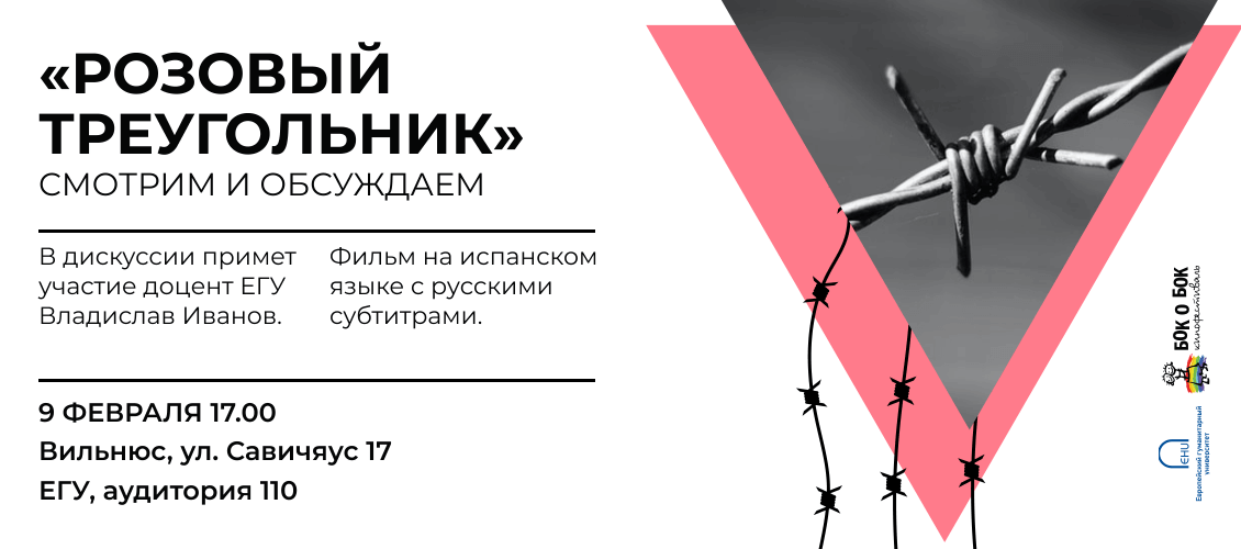 9 февраля Европейский гуманитарный университет приглашает всех желающих на кинопоказ и обсуждение документального фильма «Розовый треугольник и лечение гомосексуальности нацистами» (Аргентина, 2014; режиссёры: Эстебан Яспер и Начо Стейнберг). Мероприятие проходит при поддержке Международного ЛГБТ-кинофестиваля «Бок о Бок».