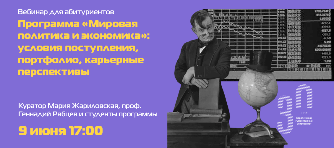 9 июня Европейский гуманитарный университет приглашает абитуриентов, их родителей и всех желающих на вебинар «Программа Мировая политика и экономика: условия поступления, портфолио, карьерные перспективы».